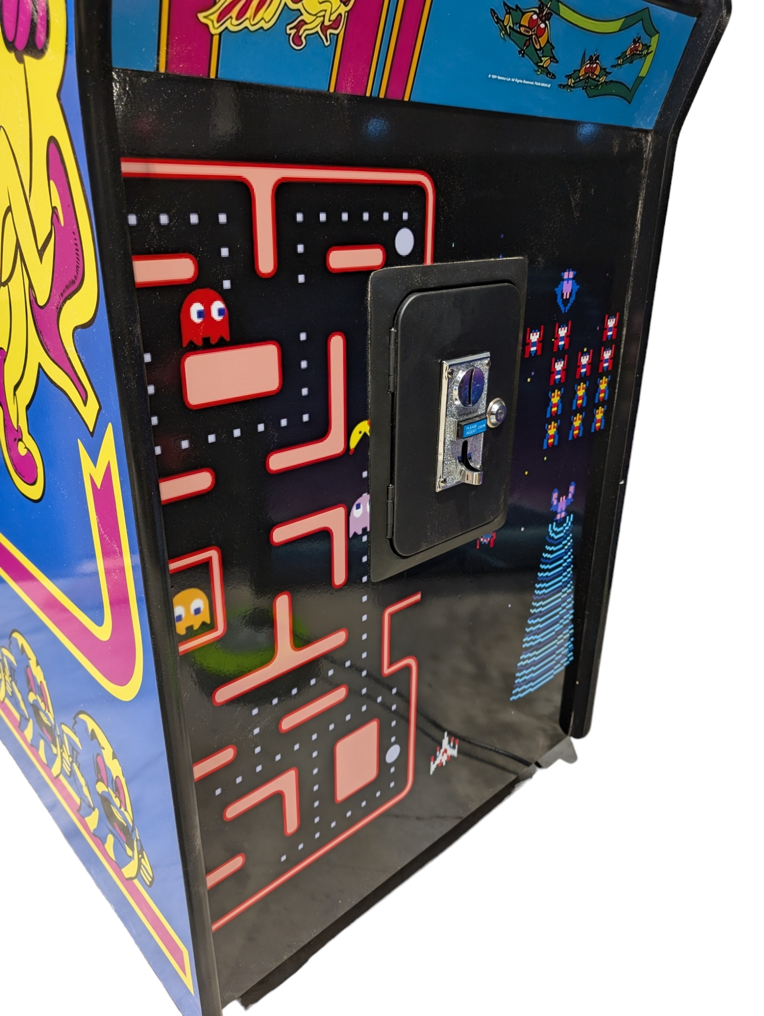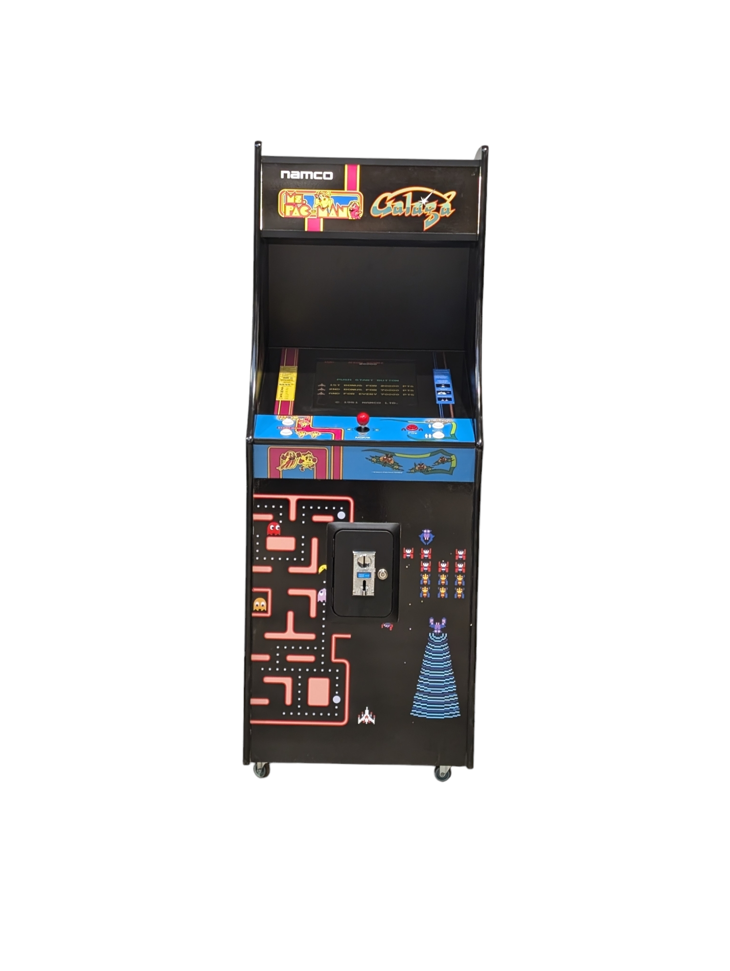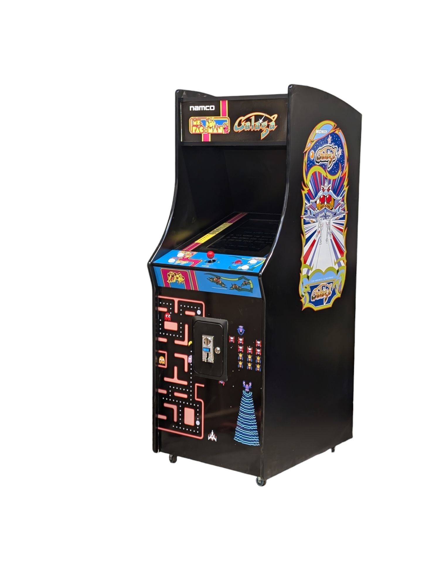 Modern features include removable control panel for easy access for maintenance and upgrades and the option of being a standalone Ms Pacman and Galaga machine or include other retro classics of the same era.